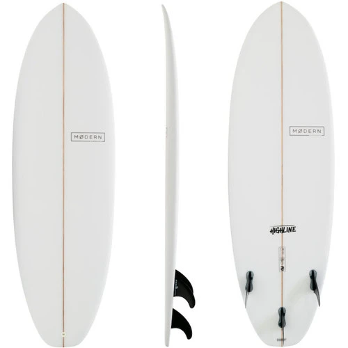 Highline surfboard model from Modern Surfboards. Design by examining what novice-to-intermediate surfers need in a surfboard to help them get as much actual surfing experience as possible. To become a better surfer, catching waves and increasing your confidence is the key, so we designed this board to be very buoyant (easy to paddle), stable (easy to get to your feet), and easy to control (smooth turns & go where you want on a wave). Essentially, we built this board to re-define the first steps in surfing so people develop their skills quicker and maximise the enjoyment they get from riding waves.