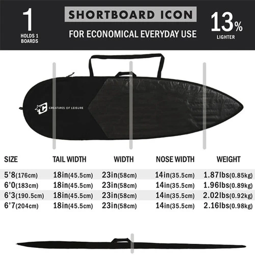 ICON Lite Boardcovers are designed for economic day-to-day use. The single board capacity covers are perfect for in-home storage or in-car transport to and from the beach. Dimensions in last picture. Ideal for shortboard surfboard only max width 23inch.