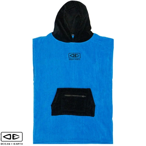 Ocean and Earth Luscious and thick Kids Hooded Poncho in Black & Blue. Functional surf poncho, warm velour cotton with hood. Make changing in public or in the elements much more convenient. Kids love to run amok in these around the beach, pool and river as well.Â