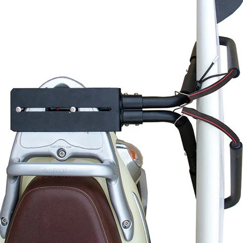 With parking at the beach in short supply, or parking meters sucking the coins out of your piggy bank at your favourite break – some switched on surfers are turning to scooters as the best way to get down to the waves without the dramas of taking a car or the surf van. This attachment will fit most motorised scooters or even motorbike so you can safely caddy your board down with you. “Look mum, no hands”. Â